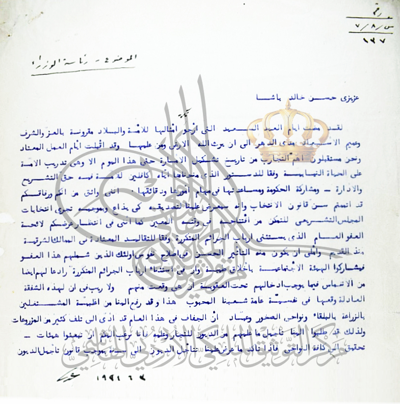 مركز التوثيق الملكي ينشر رسالة موجهة من جلالة الملك عبد الله الأول الى رئيس الوزراء حسن خالد أبو الهدى لإجراء انتخابات المجلس التشريعي الأول في عام 1929م
