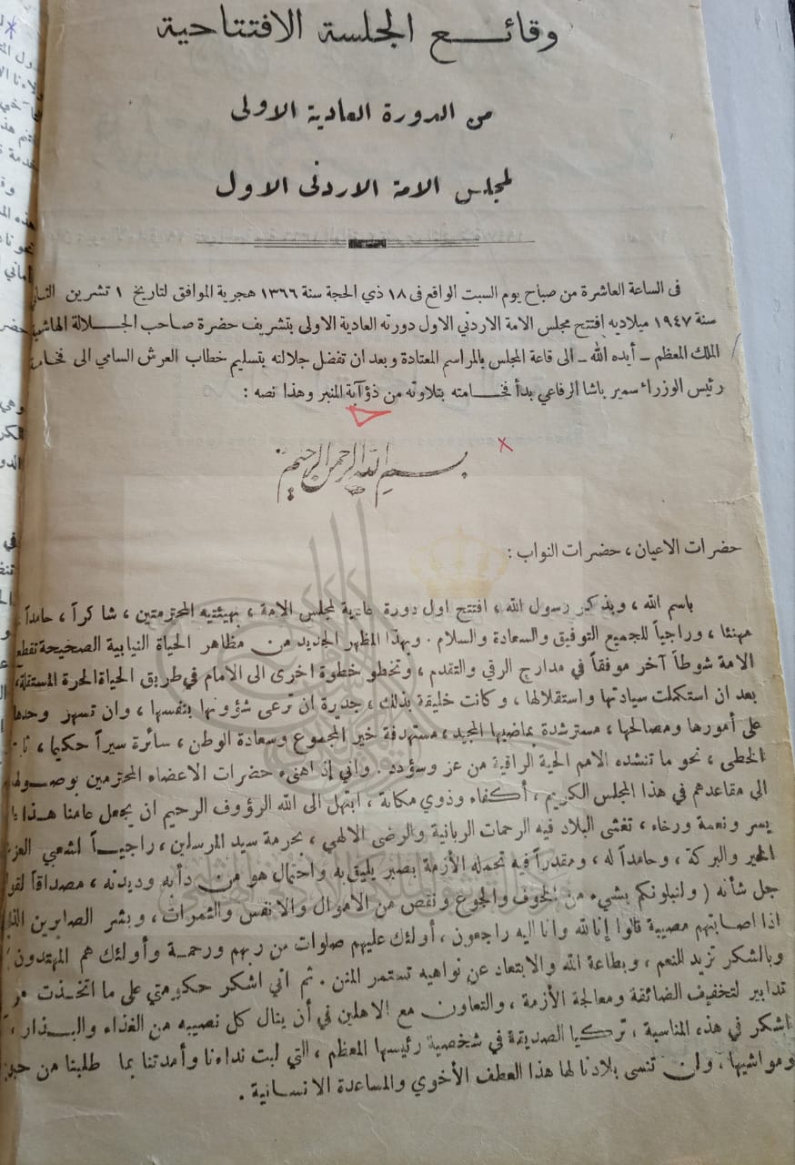 مركز التوثيق الملكي الأردني الهاشمي ينشر وثيقة خطاب العرش الأول أمام مجلس الأمة عام 1947م