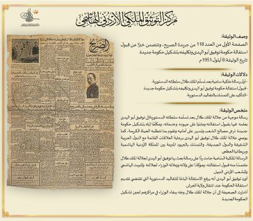 نشر مركز التوثيق الملكي الأردني الهاشمي وبمناسبة الذكرى الحادية والسبعين لتولي جلالة الملك طلال سلطاته الدستورية، خبرًا تمّ نشره في العدد 118 من جريدة الصريح الصادرة بتاريخ 8 أيلول 1951م، تضمّن أول ...