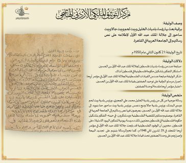 مركز التوثيق الملكي يعرض وثيقة بمناسبة الذكرى 72 لوحدة الضفتين