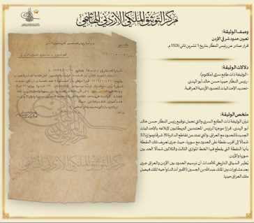 عرض مركز التوثيق الملكي الأردني الهاشمي، وثيقة مؤرخة بتاريخ الأول من تشرين الثاني الذي يصادف اليوم، توضّح الإحداثيات الجديدة للحدود مع العراق والتي تمتد من تقاطع الدائرة 39 شرقًا وموازيًا 32 شمالًا ...