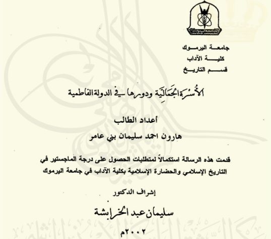 قدمت هذه الرسالة استكمالاً لمتطلبات درجة الماجستير في التاريخ الاسلامي والحضارة الإسلامية بكلية الآداب - جامعة اليرموك