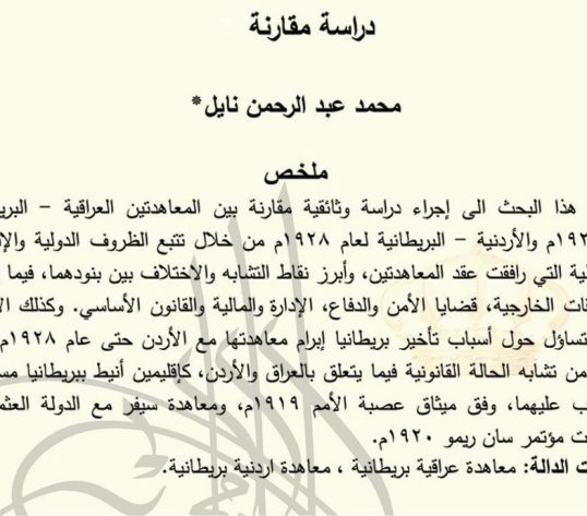 يهدف هذا البحث الى اجراء دراسة وثائقية مقارنة بين المعاهدتين العراقية – البريطانية لعام 1922، والأردنية البريطانية لعام 1928 من خلال تتبع الظروف الدولية والإقليمية والداخلية التي رافقت عقد المعاهدتين، وأبرز نقاط التشابه والاختلاف بين بنودهما، فيما يتعلق بالعلاقات الخارجية، قضايا الأمن والدفاع، الإدارة والمالية والقانون الأساسي. وكذلك الإجابة عن التساؤل حول أسباب تأخير بريطانيا إبرام معاهدتها مع الأردن حتى عام 1928م على الرغم من تشابه الحالة القانونية فيما يتعلق بالعراق والأردن، كإقليمين أنيط ببريطانيا مسؤولية الانتداب عليهما، وفق ميثاق عصبة الأمم 1919م، ومعاهدة سيفر مع الدولة العثمانية ومقررات مؤتمر سان ريمو 1920م.