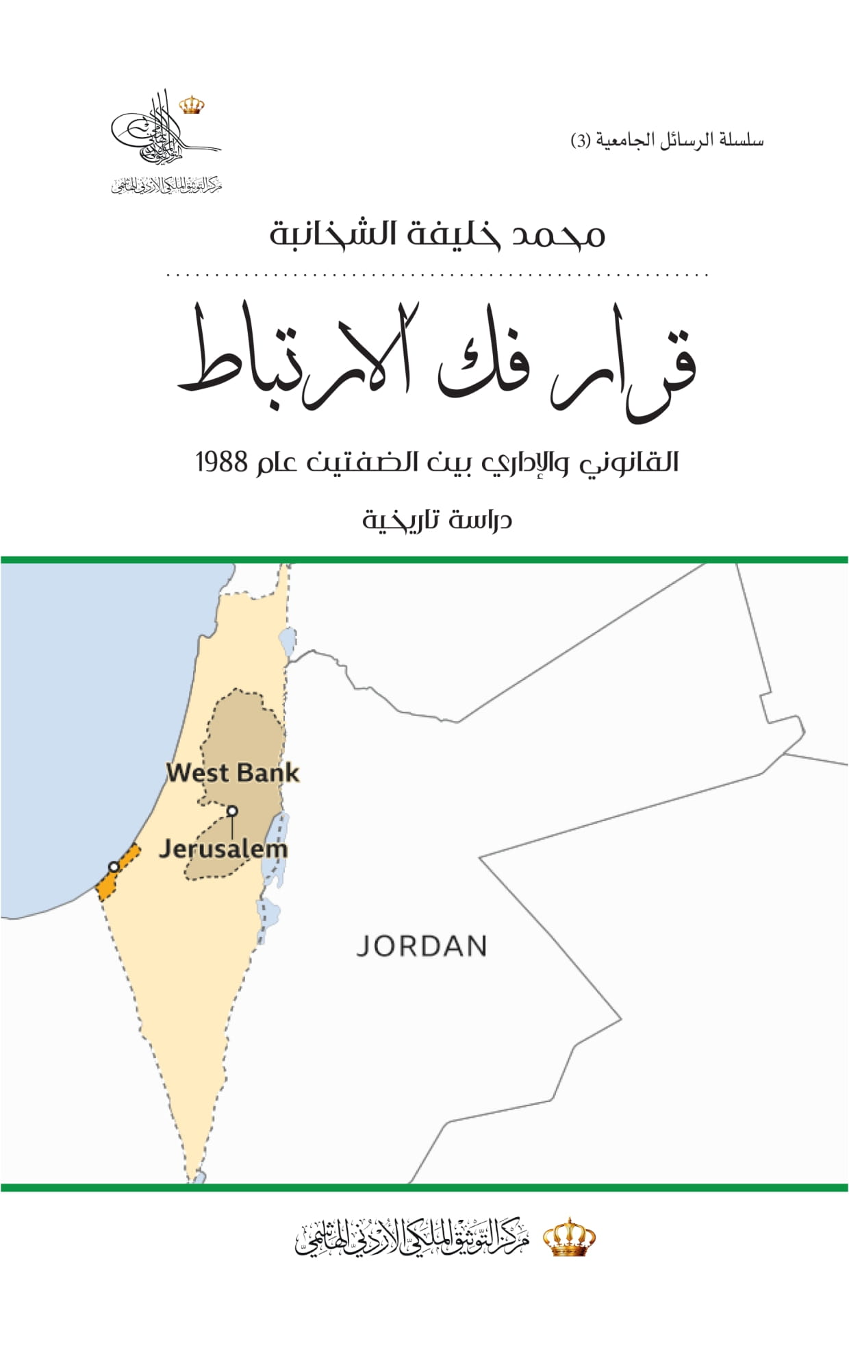 Decision to Dissolve the Legal and Administrative Connection Between the Two Banks in 1988: A Historical Study" Authored by: Mohammad Khalifa Al-Shakhanbeh. Published by the Royal Hashemite Documentation Center of Jordan as part of the University Thesis Series (3) in 2021, the study titled "Decision to Disengagement the Legal and Administrative Connection Between the Two Banks in 1988: A Historical Study" by researcher Mohammad Khalifa Al-Shakhanbeh, is a master's thesis in modern and contemporary history from the University of Jordan, awarded in 2020. The study consists of an introduction, a preliminary section, four chapters, and a conclusion. The first chapter addresses the circumstances leading up to the decision to Disengagement the connection, discussing the establishment of the Palestine Liberation Organization (PLO) and Jordan's interactions with it. The researcher reviews the Jordanian-Palestinian dialogue between 1965 and 1974, a sensitive period marked by disputes and competition for representation of the Palestinian people. The researcher also discusses the 1974 Rabat Conference, which led to the PLO being recognized as the sole legitimate representative of the Palestinian people and transformed the West Bank from Jordanian territory to a disputed area, and touches upon the 1982 Arab Summit in Fez. The second chapter focuses on the decision to Disengage the administrative and political connection between the two banks. It begins with the 1984 by-elections, held after a hiatus in parliamentary life since the occupation of the West Bank in 1967, and then delves into the First Palestinian Intifada in 1987 and its impact on Jordanian-Palestinian relations. The chapter also covers the drafting and adoption of the decision to dissolve the Disengagement, including the announcement of the decision, the reasons and convictions leading to it, and concludes with the reaction to the decision. The third chapter is dedicated to the implications of the decision on both the Jordanian and Palestinian sides. The researcher highlights the significant social, political, economic, and administrative problems resulting from this decision. Notably, it led to the dissolution of government bodies in the West Bank, including the Ministry of Affairs of the Occupied Territories, replaced by the Palestine Affairs Department under the Foreign Ministry. Additionally, all employees from the West Bank were retired, with the PLO committing to take full responsibility for the employees affected by the decision. The fourth chapter of the study presents the reflections of the decision to dissolve the connection on the Arab-Israeli peace process. It discusses the Madrid Conference in 1991, the confidential Oslo Accords in 1993, and the Wadi Araba Agreement in 1994. The study also reviews the constitutionality and legitimacy of the decision and the problem issue of refugees. The sources utilized in the research are diverse, with key materials being documents issued by the Jordanian government. These include documents from the Palestine Affairs Department under the Jordanian Ministry of Foreign Affairs, documents from the Jordanian Cabinet published in the official gazette, and various ministries. These sources are significant for containing directives, news, and procedures related to the decision to dissolve the connection. The study also relied on personal memoirs that witnessed the events under study. Notable among these are the collection of books and memoirs penned by King Hussein bin Talal, "Rihlat Omur" by Abdul Salam Majali, "From the Summit to Defeat with Kings and Presidents" by Ahmed Al-Shukairy, among others. Arab newspapers and periodicals also contributed significantly to this study, with prominent ones being Al-Rai, Al-Dustour, Al-Quds newspaper, Al-Fajr, and Al-Shaab. The researcher enriched the study by interviewing several political figures who played a significant role in decision-making at the time, in addition to utilizing a vast array of Arab and foreign references. For inquiries and orders. The publications from the Hashemite Documentation Center are not translated into English. Institutions and publishing houses interested in publishing a translated version should contact the center at the following email address: Info@rhdc.jo. This offers an opportunity for broader access to these valuable historical resources for non-Arabic speaking audiences and researchers.