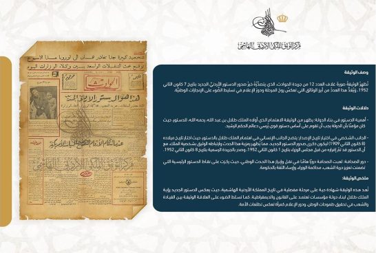 نشرَ مركزُ التوثيق الملكي الأردني الهاشمي وثيقةً تاريخيَّةً من أرشيفه تُظهِرُ صورةَ غلاف العدد 12 من جريدة الحوادث، وتبرُزُ أهميَّةُ هذا العدد الصادر بتاريخ 7 كانون الثاني 1952 في احتفائه بصدور الدستور الجديد للمملكة الأردنيَّة الهاشميَّة، وقد اختار القائمون على هذا العدد تسليطَ الضَّوء على أهميَّة الدستور الجديد عبرَ مانشيت رئيسٍ يحملُ العنوان: "هذا هو الدستورُ الأردنيُّ الجديد - الأمَّة مصدر السُّلطات - حريَّة الشعب - محاكمة الوزراء - الثقة بالوزارة". ويميِّزُ تاريخَ إصدار الدستور أنه يصادفُ تاريخَ ميلاد الملك طلال في ال8 من كانون الثاني 1909، علمًا بأنّ الدستور قد تمّ إقراره من مجلس الوزراء بتاريخ 1 كانون الثاني 1952.