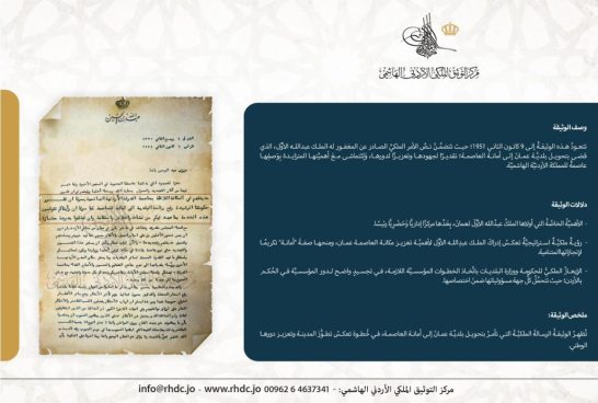 وتُبيِّنُ الوثيقةُ أنَّ الرسالةَ وُجِّهَت إلى الباشا عبد الرحمن الفواعير، الذي كان يشغلُ منصبَ رئيس البلديَّة آنذاك، لِيُصبحَ لاحقًا أوَّلَ أمينٍ للعاصمة؛ حيث جاء في الأمر الملكيِّ توجيهٌ للحكومة ووزارة البلديات بالعمل على تنفيذ هذا القرار، بما يتناسبُ مع الدَّور المتنامي الذي باتت تضطلعُ به العاصمةُ. وَيَظهَرُ من ذلك مشاركةُ الملك الأردنيين بأهميَّة عاصمتهم والاعتزاز بها.