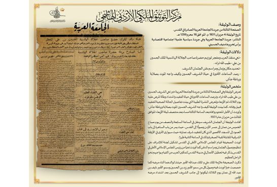 تزامنًا مع الذكرى 91 لوفاة المغفور له الشريف الحسين بن علي، والتي تصادف اليوم الجمعة الثالث من حزيران، عرض مركز التوثيق الملكي خبرًا تمّ نشره في جريدة الجامعة العربية في الصفحة الثالثة من العدد الصادر بتاريخ 4 حزيران سنة 1931 في القدس، تناول الخبر نعي والد الملوك منقذ العرب ومفجر ثورتهم حضرة صاحب الجلالة الملك الحسين بن علي المعظم، كما رصد الساعات الأخيرة في حياة الفقيد واشتداد وطأة المرض عليه، كما بيّن الخبر مكان وزمان ومراسم تشييع الجثمان.