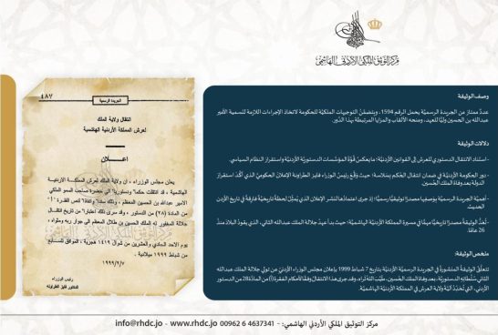 بمناسبة الذِّكرى السادسة والعشرين لِتَسلُّم جلالة الملك عبدالله الثاني سُلُطاتِهِ الدستوريَّة، نشرَ مركزُ التوثيق الملكي الأردني الهاشمي وثيقةً تاريخيَّةَ ذاتَ أهميَّةٍ في التاريخ الأردني الحديث، هي الصَّفحةُ رقم 487 من الجريدة الرسميَّة الصادرة بتاريخ 7 شباط 1999، التي تتضمَّنُ إعلانَ مجلس الوزراء أنَّ ولاية العرش في المملكة الأردنيَّة الهاشميَّة قد آلت إلى ولي عهد المغفور له الملك الحُسين، جلالةِ الملك عبدالله الثاني، لِيُصبحَ ملكًا على المملكة الأردنيَّة الهاشميَّة استنادًا إلى الفقرة (أ) من المادَّة 28 من الدستور الأردني.