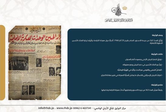 نشرَ مركزُ التوثيق الملكي الأردني الهاشمي وثيقةً تاريخها 25 آذار 1968، بالتزامن مع ذكرى معركة الكرامة، والتي حصلت بتاريخ ( 21-3-1968)جسَّد فيها الجيشُ العربي الأردني أروعَ البطولات والتضحيات في الدفاع عن الوطن. تُظهِرُ الوثيقةُ الصفحةَ الرئيسةَ من جريدة الدستور، العدد 343،  التي يتصدَّرُها خبرُ زيارة الملك الحُسين الوحداتِ العسكريَّةَ الأماميَّةَ بعد المعركة، وإشادته ببسالة الجيش وتهنئته بالنصر. كما تتناول الصحيفةُ آثارَ المعركة؛ فرحَ الأردنيين، والتوحُّدَ القومي العربي، إضافةً إلى اعتراف الجيش الإسرائيلي بخسائره.