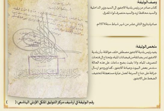 نشر مركز التوثيق الملكي الأردني الهاشمي صورة لكتاب صادر عن رئيس بلدية الأجفور إلى وزير الداخلية ومحافظ اربد ومتصرف لواء المفرق بتاريخ 12 شباط 1974. وبحسب الوثيقة يفيد رئيس بلدية الأجفور مصطفى خلف عواقلة بأن البلدية تمر بضائقة من فيضانات المياه وتحتاج إلى فتحات لتصريف المياه، واذا بقيت بضع ساعات على هذه الحالة ستدمر بعض البيوت وعيادة الأجفور. ورجا بالوثيقة ارسال جرافة على جناح السرعة لعمل عبارة مستعجلة لتخفيف الضغط على الاجفور.