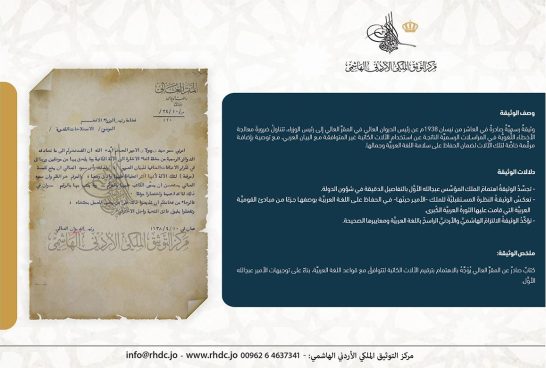 مركزُ التوثيق الملكي ينشرُ وثيقةً تاريخيَّة تُظهِرُ الاهتمامَ الهاشميَّ بصون اللغة العربيَّة