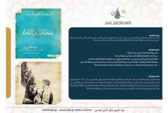 احتفالاً بيوم الجيش الذي يوافق العاشر من حزيران، يقوم مركز التوثيق الملكي الأردني الهاشمي بإعادة إصدار عدد خاص من المجلة العسكرية، وهو العدد رقم 86 الذي صدر عام 1971م بمناسبة اليوبيل الذهبي لتأسيس الجيش العربي الأردني. يتضمن هذا العدد المميز توثيقاً لأهم الأحداث الوطنية والتطورات العسكرية التي شهدها الجيش خلال الخمسين عاماً الأولى من تأسيسه. ويسلط الضوء على النقاط الفاصلة والنقلات النوعية التي مرت بها الدولة الأردنية، مما يجعله مرجعاً مهماً للباحثين والمهتمين بتاريخ الوطن.