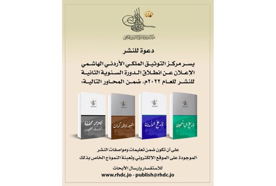 يسرّ مركز التوثيق الملكي الأردني الهاشمي الإعلان عن إنطلاق الدورة السنوية الثانية للنشر للعام 2022، وذلك ضمن المحاور الآتية: - تاريخ الهاشميين. - تاريخ الأردن. - السّير والمذكرات. - نصوص محقّقة (دراسة وتحقيق). على أن تكون ضمن تعليمات ومواصفات النشر الموجودة على الموقع الإلكتروني، وتعبئة النموذج الخاص بذلك. للإستفسار وإرسال الأبحاث يُرجى التواصل على الأرقام الموجودة على الموقع الإلكتروني www.rhdc.jo، أو ارسال ايميل على publish@rhdc.jo