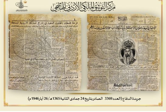 وقال المركز إن جريدة الدفاع اليافاوية في العدد 3369 الصادر بتاريخ 26 أيار 1946، خصّصت صفحتيها الأولى والرابعة لتغطية الاستقلال، ونشرت الصفحة الأولى أحداث الاحتفال بالبيعة وإعلان الاستقلال في شرق الأردن، واعلان صاحب الجلالة الهاشمية عبدالله بن الحسين أن قضية فلسطين العربية نصب عينيه، وأن الأردن يعتزّ بالوفاء للوحدة القوميّة والمُثل العربية. كما نشرت في الصفحة الرابعة فرحة فلسطين بالحادث السعيد في تاريخ المملكة، واشتراك الهيئات الوطنية وقناصل الدول العربية في مهرجانات البيعة للملك، وبرقيات التهاني لصاحب الجلالة الملك عبدالله المؤسس