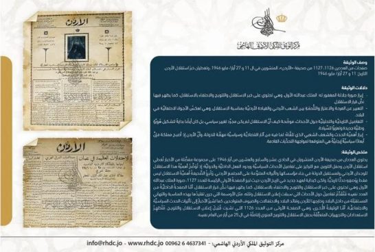 نشرَ مركزُ التوثيقِ الملكيُّ الأردنيُّ الهاشميُّ وثيقةً نادرةً تتضمَّنُ نصَّ القرار التاريخيِّ الذي أقرَّهُ مجلسُ الأمَّةِ الأردنيُّ في جلسته المنعقدة بتاريخ 24 نيسان 1950، والقاضي بإعلان وحدة الضفَّتين: الشرقيَّة والغربيَّة، في إطار المملكة الأردنيَّة الهاشميَّة. وقد جرى نشرُ القرار رسميًّا في الجريدة الرسميَّة الصادرة بتاريخ 13 أيار 1950.