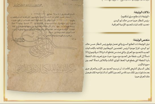 عرض مركز التوثيق الملكي الأردني الهاشمي، وثيقة مؤرخة بتاريخ الأول من تشرين الثاني الذي يصادف اليوم، توضّح الإحداثيات الجديدة للحدود مع العراق والتي تمتد من تقاطع الدائرة 39 شرقًا وموازيًا 32 شمالًا إلى أقرب نقطة على الحدود مع سوريا حيث جرى تعريف تلك النقطة بأنها النقطة التي يقطع فيها الخط الموازي الثالث والثلاثين شمالًا الحد بين سوريا والأردن. يظهر السياق التاريخي للأحداث أن ترسيم الحدود بين الأردن والعراق جرى بعد مشاورات بين الملك عبدالله بن الحسين (الأمير آنذاك) وأخيه الملك فيصل ملك العراق حينها.