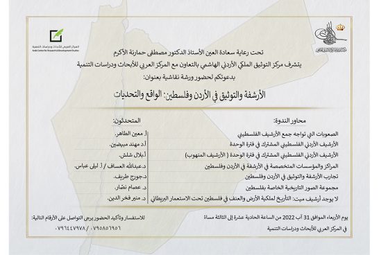 ينظم مركز التوثيق الملكي الأردني الهاشمي برعاية سعادة الدكتور مصطفى حمارنة، وبالتعاون مع المركز العربي للأبحاث ودراسات التنمية؛ ورشة نقاشية بعنوان: "الأرشفة والتوثيق في الأردن وفلسطين| الواقع والتحديات". يتناول فيها الباحثون المحاور التالية: - الصعوبات التي تواجه جمع الأرشيف الفلسطيني/ أ. معين الطاهر. - الأرشيف الأردني الفلسطيني المشترك في فترة الوحدة/ أ. د مهند مبيضين - الأرشيف الأردني الفلسطيني المشترك في فترة الوحدة ( الأرشيف المنهوب)/ أ. بلال شلش - المراكز والمؤسسات المتخصصة في الأرشفة في الأردن وفلسطين/ د. عبد الله العساف والأستاذة ليلى عباس. - تجارب الأرشفة والتوثيق في الأردن وفلسطين/ د. جورج طريف. - مجموعة الصور التاريخية الخاصة بفلسطين/ د. عصام نصّار. - لا يوجد أرشيف ميت: التأريخ لملكية الأرض والعنف في فلسطين تحت الاستعمار البريطاني/ د. منير فخر الدين. وذلك في قاعة مكتبة الأرشيف في عمان، كما تبث الورشة في تمام الساعة الحادية عشرة والنصف صفحة مركز التوثيق الملكي الأردني الهاشمي والمركز العربي للأبحاث ودراسات التنمية، وذلك من خلال تطبيق الزووم على الرابط التالي: https://us06web.zoom.us/j/87483314503 نستقبل مداخلات وأسئلة الحضور من خلال صفحة مركز التوثيق الملكي الأردني الهاشمي والمركز العربي للأبحاث ودراسات التنمية على الفيسبوك، وعبر تطبيق الواتسآب على الأرقام التالية: 00962796447978 / 0096279586956