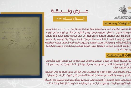 ينشرُ مركزُ التوثيقِ الملكيُّ الأردنيُّ الهاشميُّ وثيقةً رسميَّةً تعودُ إلى 27 تموز 1927، تُسلِّطُ الضَّوءَ على تعميم حكومي أصدرته حكومةُ إمارة شرق الأردن عقبَ الزلزال العنيف الذي ضرب المنطقةَ في ذلك العام، المعروفِ تاريخيًّا بـ"زلزال نابلس"، الذي امتدَّ تأثيرُهُ إلى الأراضي الأردنيَّة. وتكمُنُ أهميَّةُ الوثيقةِ في أنَّها تُظهِرُ استجابةً رسميَّةً مبكِّرةً وفريدةً من نوعها لحادث طبيعي مدمِّر، في وقت كانت فيه المواردُ شحيحةً والإمكاناتُ الإداريَّةُ والمؤسَّسيَّةُ لا تزالُ في طور التأسيس. ورغم ذلك، تُشيرُ الوثيقةُ إلى وجود تحرُّك حكوميٍّ واضح يتضمَّنُ تنبيهاتٍ وتوجيهات، وربَّما إجراءاتٍ احترازيَّةً للحدِّ من الخسائر